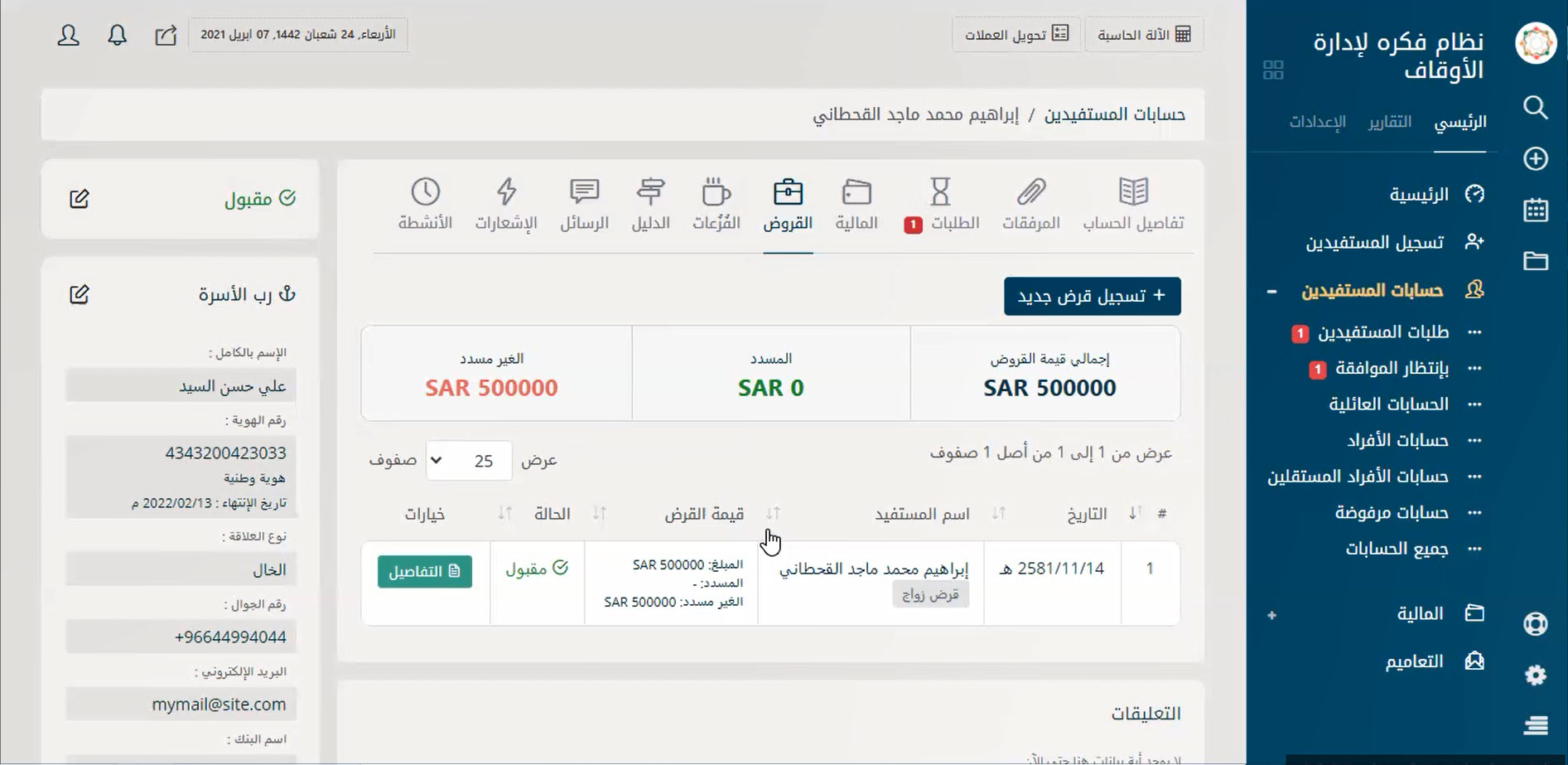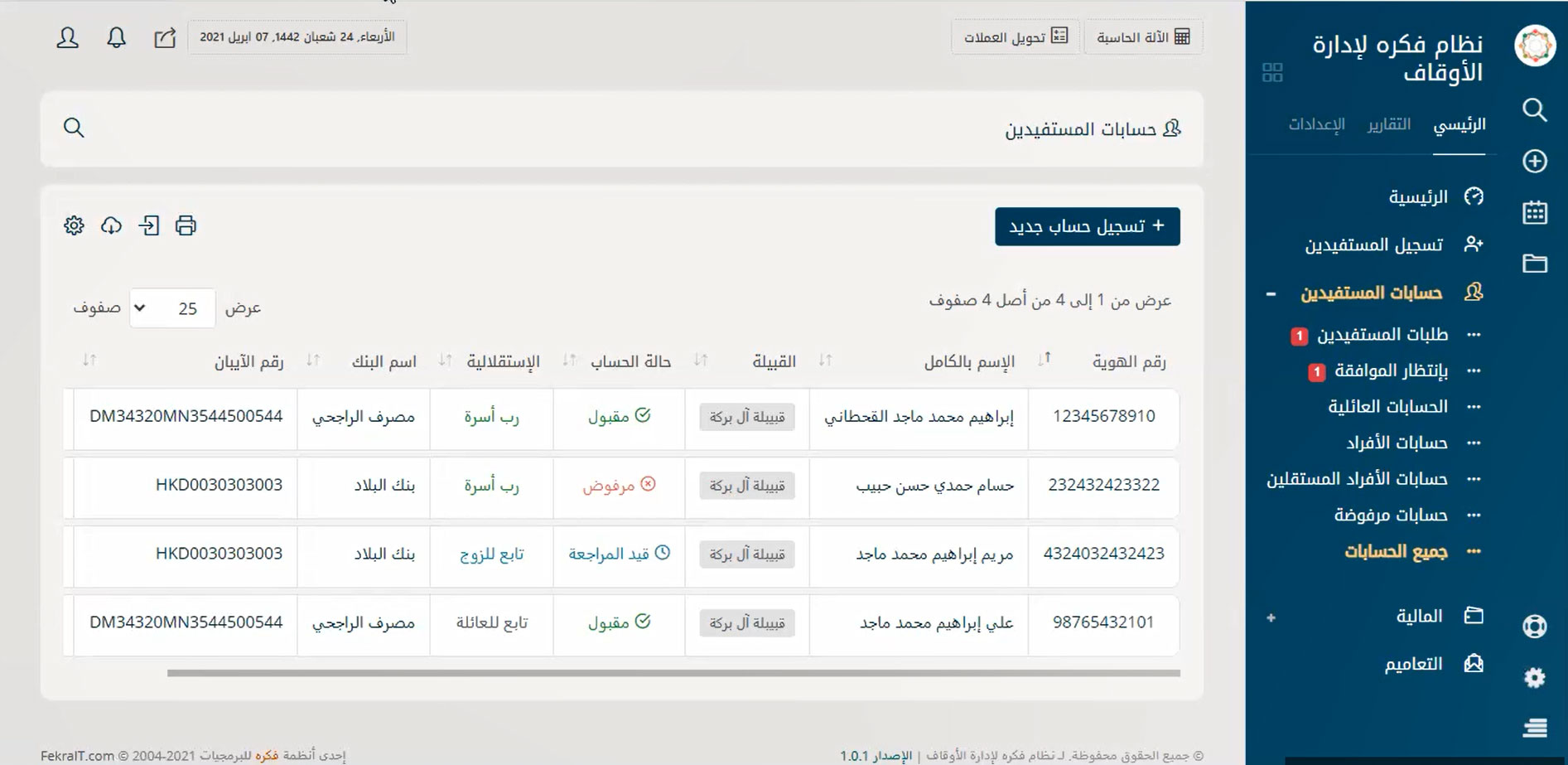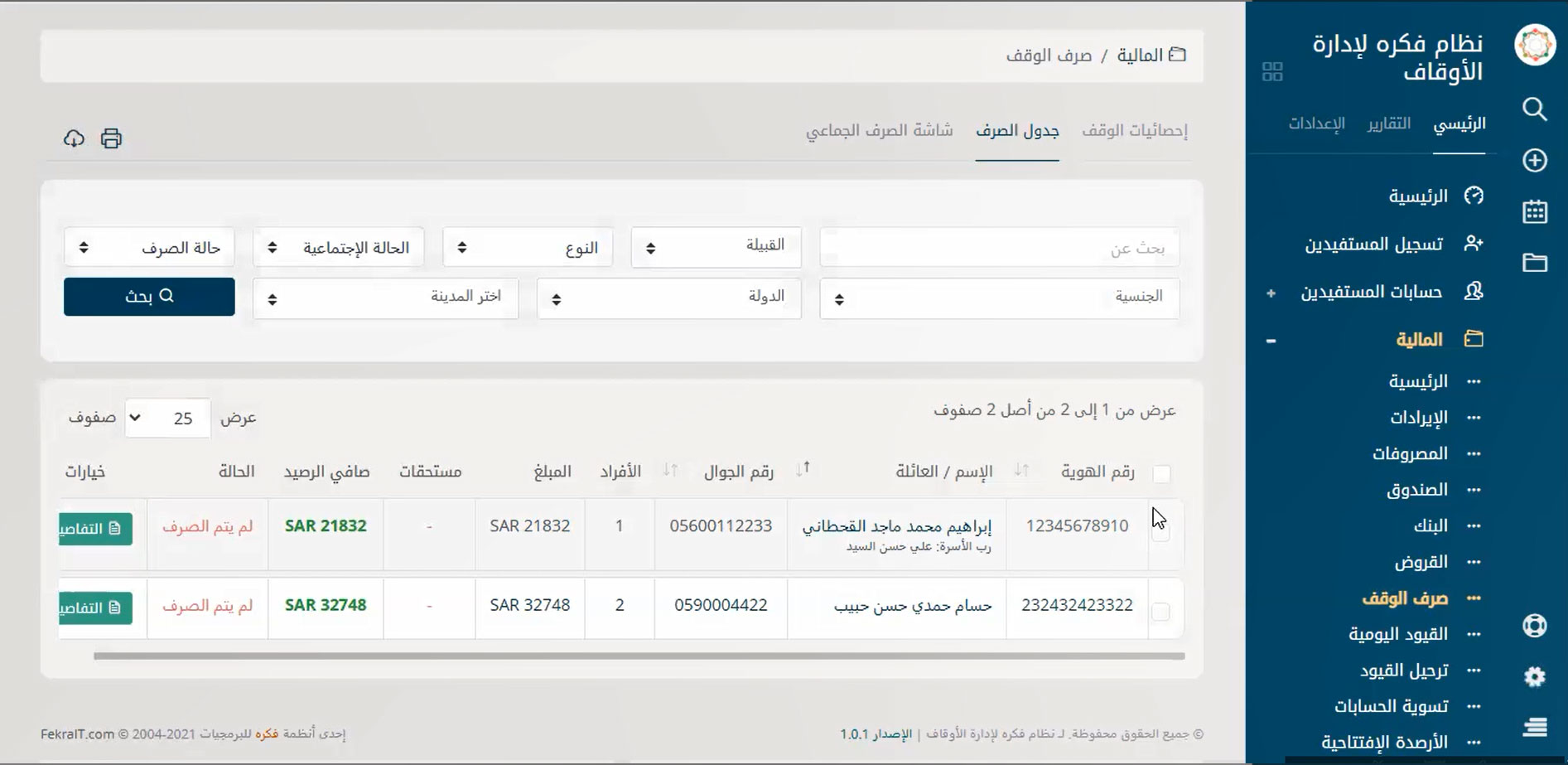 نظام إدارة متكامل لإدارة حسابات الموقوف عليهم والمستفيدين من الوقف بسهولة لتحقيق التحكم في كافة الأمور المتعلقة بهم مثل البحث عنهم بأي بيانات تخصهم ودعم ميزة البحث بالتصفية سواء بالاسم أو النوع أو القبيلة أو الحالة الاجتماعية أو الجنسية أو الدولة أو حتى المدينة أو تاريخ القيد على البرنامج وأيضًا تسجيل الحسابات الجديدة والحذف والتعديل على الحسابات الموجودة ومتابعة طلبات المستفيدين المختلفة والرد عليها.