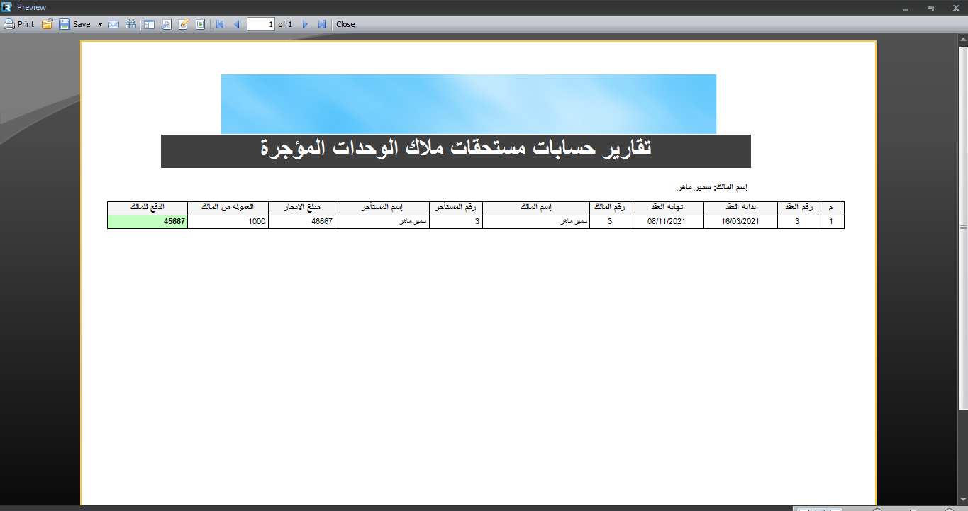 إمكانية إصدار كافة أنواع التقارير الخاصة بإدارة العقارات والأملاك المختلفة مثل تقارير العملاء والمستأجرين والتقارير المالية وتقارير قواعد البيانات والموظفين وغيرها من التقارير الهامة التي قد تحتاج إليها بشكل عام بما يعزز من قوة إدارة ومتابعة ومراقبة العمل بشكل لحظي ومباشر وأكثر دقة في أقل وقت وبأقل مجهود من أي مكان. بالإضافة إلى إمكانية التحكم في تصميم العقود والتقارير وسندات القبض والصرف كذلك.