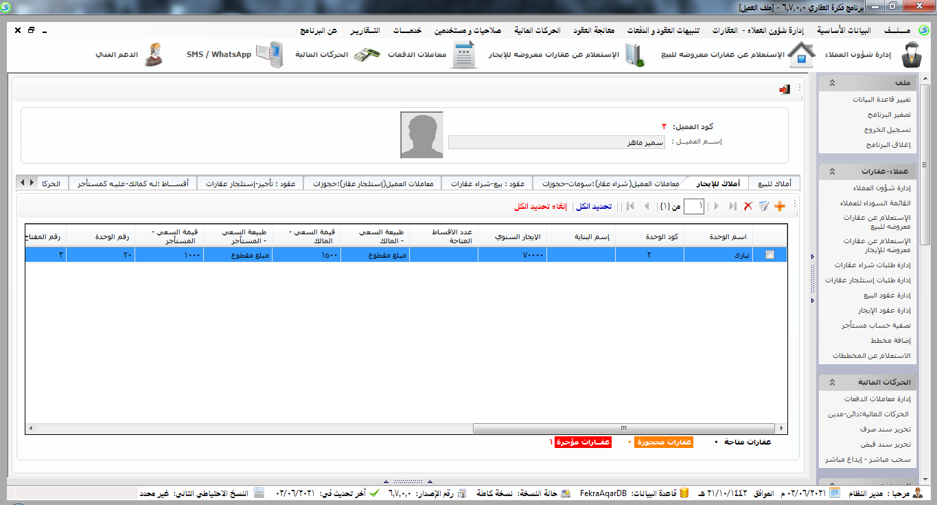 من خلال لوحة التحكم هذه يمكنك بسهولة إدارة كل شيء من أول إدارة العملاء سوء مُلاك أو مستأجرين وإنشاء ملف كامل بكل عميل على النظام يحمل كافة بياناته وسجل تعامله مع مكتب أو شركة العقارات ومرورًا بإضافة العقارات أو الوحدات السكنية لكل عقار على حدة وإنشاء ملف كامل أيضًا لكل وحدة سكنية أو شقة وبياناتها كاملة وسجل تأجيرها ومبلغ الإيجار وغيرها من البيانات والمعلومات المرتبطة بها.